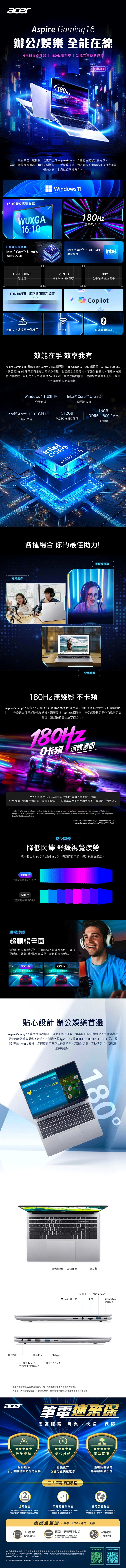 ACER 宏碁 Aspire Gaming AGM16-71P-50YD 銀 (Intel Core Ultra 5 225H/8G*2/512G/W11/WUXGA/16) 客製化AI文書筆電