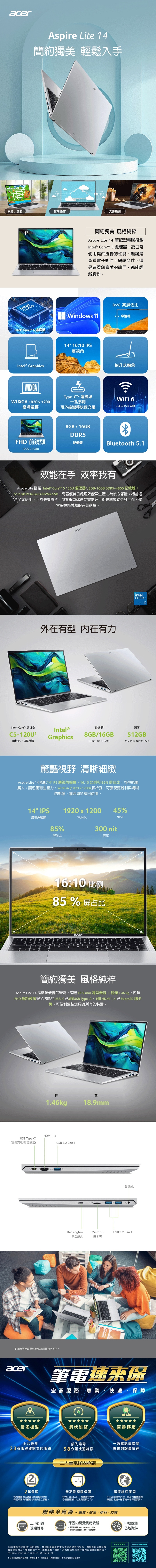 ACER 宏碁 Aspire Lite AL14-51P-52L7 銀色 (Intel Core 5 120U/16G/512GB/WIN11/WUXGA/14) 客製化文書筆電