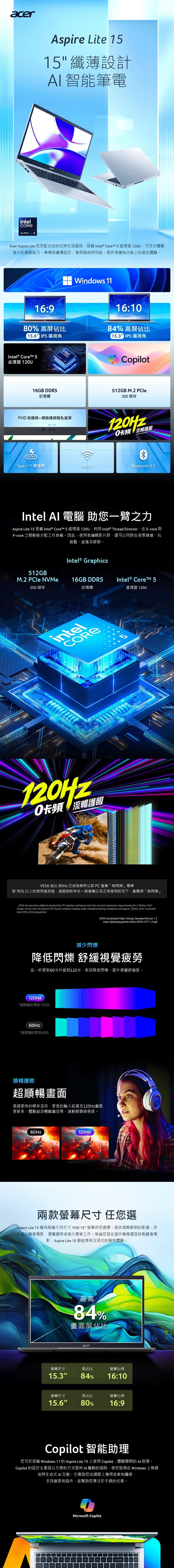 ACER 宏碁 Aspire Lite AL15-51P-50GN 銀色 (Intel Core 5 120U/16G/512GB/W11/WUXGA/15.3) 客製化文書筆電