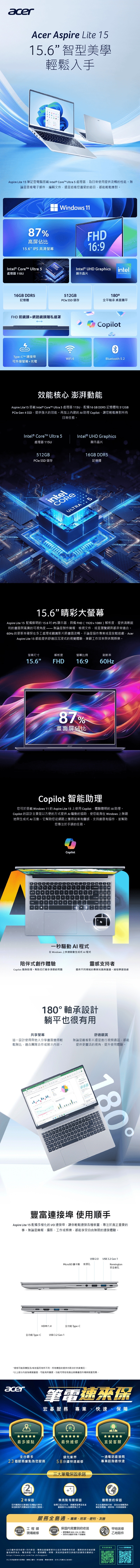 ACER 宏碁 Aspire Lite AL15-54P-576Z 銀 (Intel Core Ultra 5 115U/16G/512G/W11/FHD/15.6) 客製化AI文書筆電