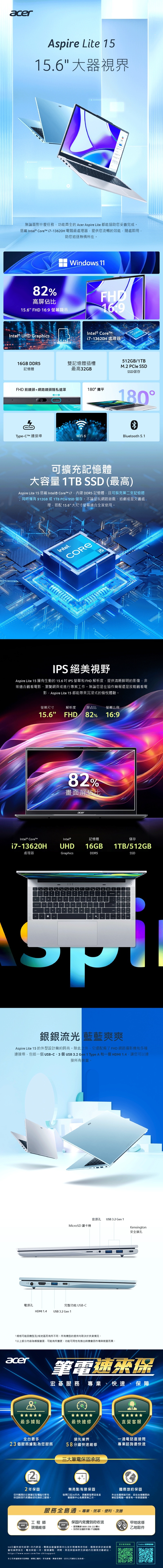 ACER 宏碁 Aspire Lite AL15-72P-75DU 銀色 (i7-13620H/16G/512G/W11/FHD/15.6) 客製化文書筆電