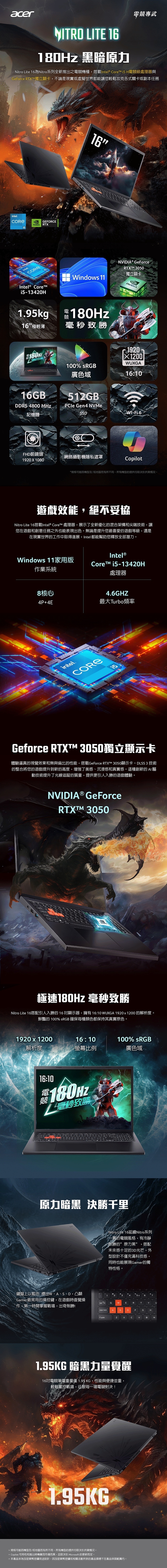 【下單再送】ACER 宏碁 Nitro Lite NL16-71G-54FQ 黑色 (i5-13420H/8+8G/512G/RTX3050/W11/WUXGA/16) 客製化電競筆電