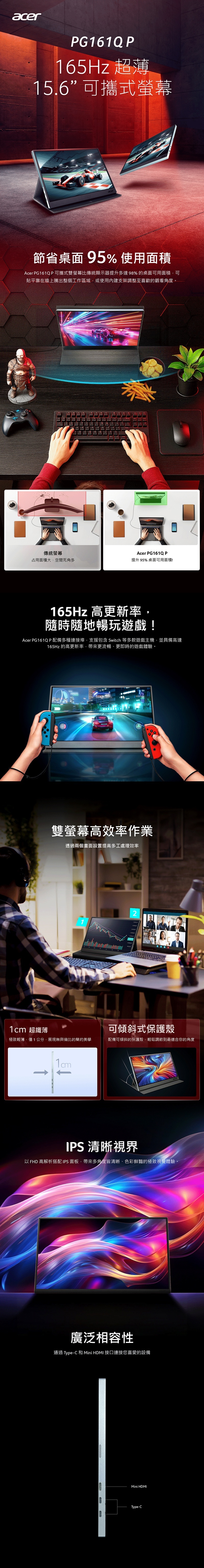 ACER 宏碁 PG161Q P 可攜式螢幕 (15.6型/FHD/165hz/IPS)