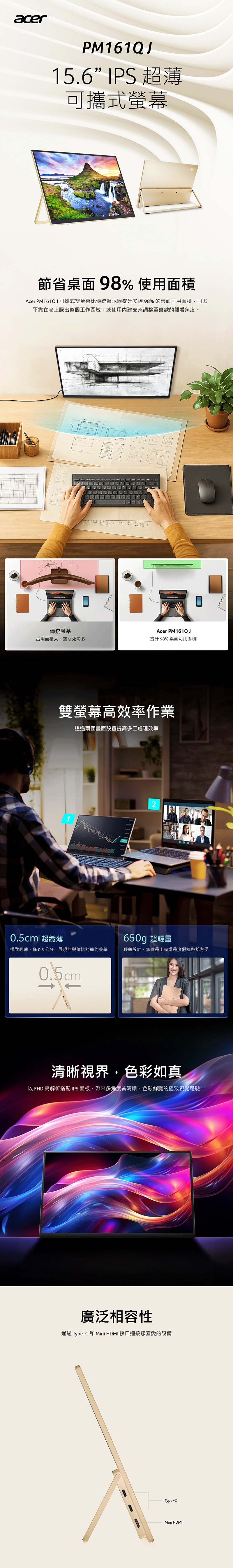 ACER 宏碁 PM161Q J 可攜式螢幕 (15.6吋/FHD/60hz/IPS)