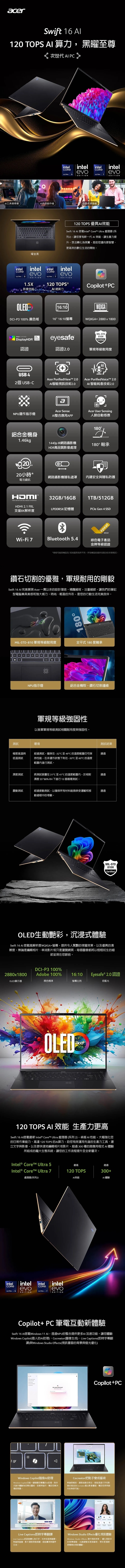 【下單再送】ACER 宏碁 Swift AI SF16-51-58JZ 黑色 (Intel Core Ultra 5 226V/16G/1TB/W11/WQXGA+/16) 客製化AI文書筆電