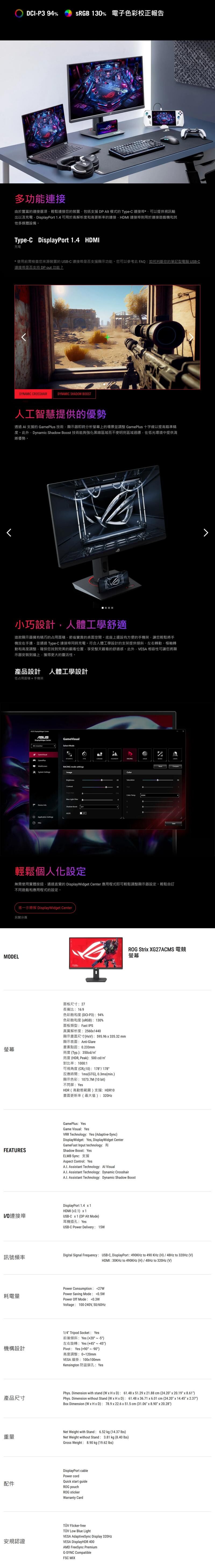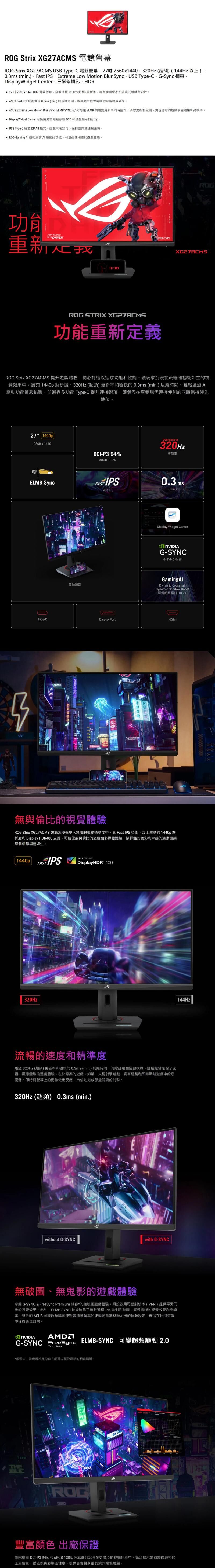 ASUS 華碩 ROG Strix XG27ACMS 電競螢幕 (27型/2K/320Hz/0.3ms/HDMI/DP/IPS/Type-C)