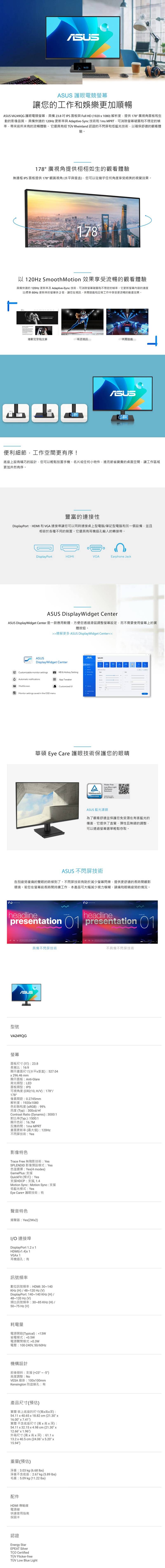 ASUS 華碩 VA249QG 護眼螢幕 (24型/FHD/120Hz/HDMI/DP/VGA/IPS)