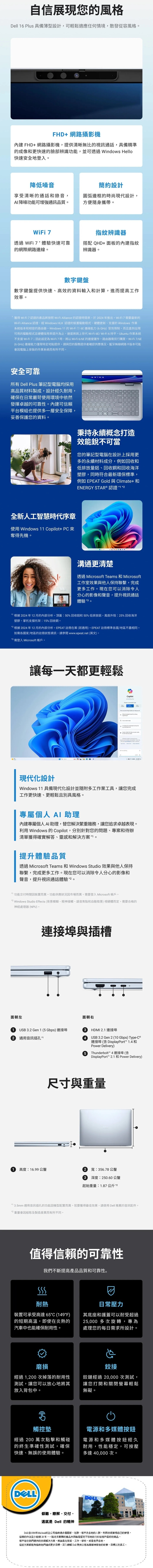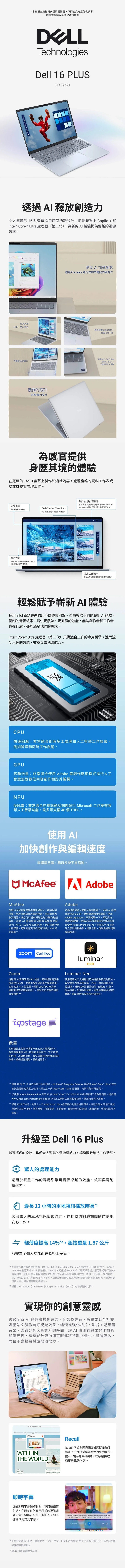 DELL 戴爾 16 Plus DB16250-R1708STW 藍色 (Intel Core Ultra 7 258V/32GB/1TB/W11/2.5K/16) 客製化AI文書筆電