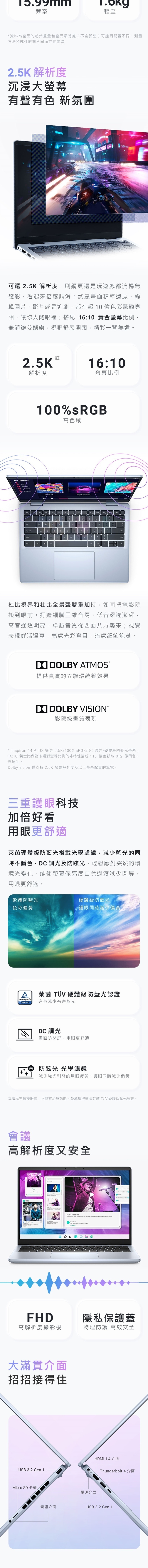 顯示器:14.0-inch 16:10 FHD+ (1920x1200) Anti-Glare Non-Touch 300nits WVA/IPS Display w/ ComfortView Support