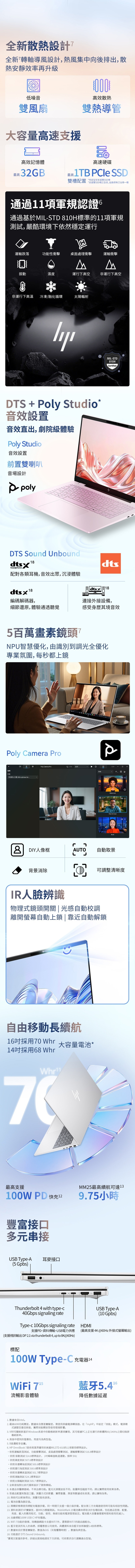 喇叭/音效技術:Poly Studio / Dual Speakers / DTS X: Ultra 音校技術 / 支援 HP Audio Boost 2.0 (w/ discrete smart amp solution)