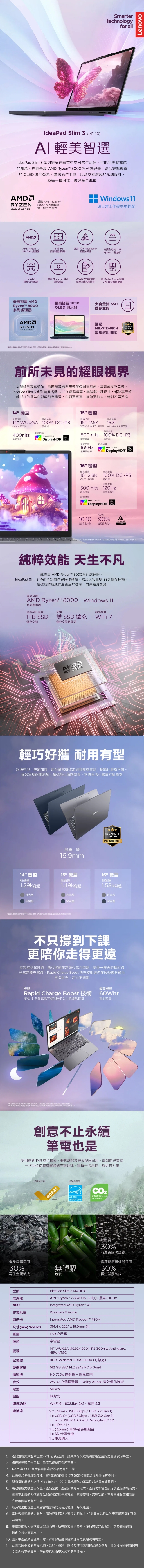 【下單再送】【🎉 免費升16G】Lenovo 聯想 IdeaPad Slim 3 14AHP10 83K90011TW 藍 (AMD Ryzen 7 8840HS/8G/512G/W11/WUXGA/14) 客製化商務筆電