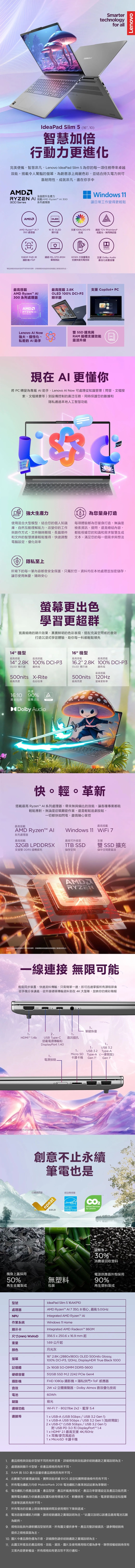 Lenovo 聯想 IdeaPad Slim 5 16AKP10 83HY004QTW 灰色 (AMD Ryzen AI 7 350/16Gx2/512G/W11/2.8K/16) 客製化AI文書筆電