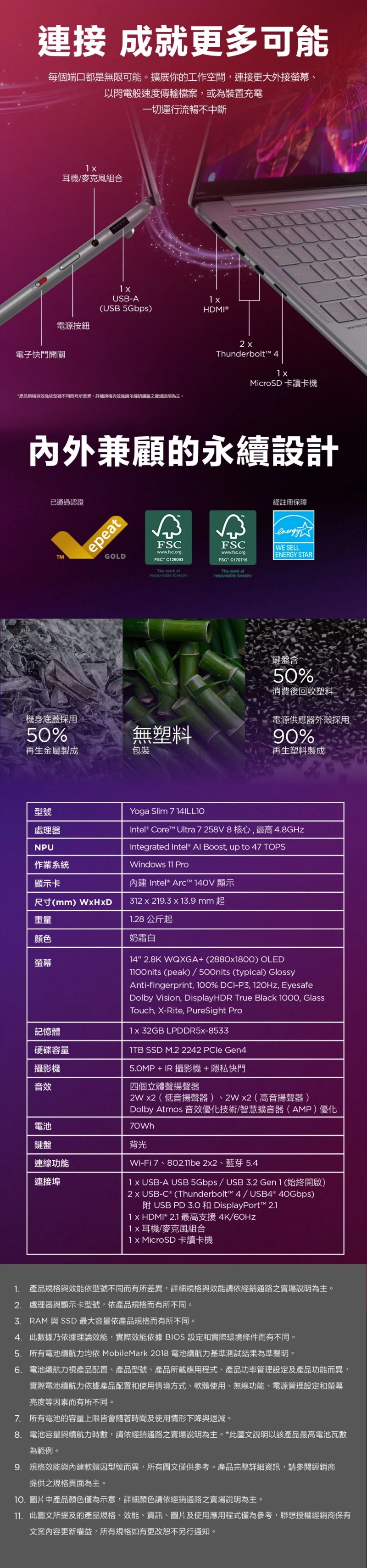 【下單再送】Lenovo 聯想 Yoga Slim 7i 14ILL10 83JX0087TW 白 (Intel Core Ultra 7 258V/32G/1TB/W11P/2.8K/14) 客製化AI觸控商務筆電