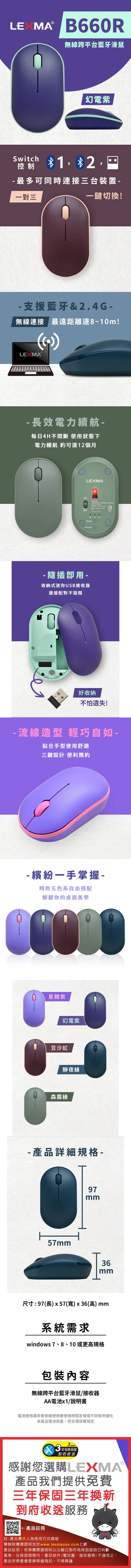 LEXMA 雷馬 B660R 無線跨平台藍牙滑鼠-幻電紫