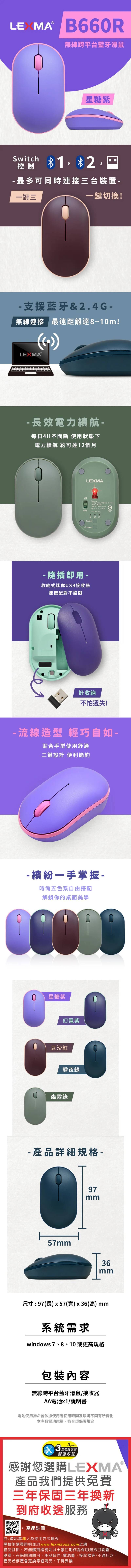 LEXMA 雷馬 B660R 無線跨平台藍牙滑鼠-星糖紫