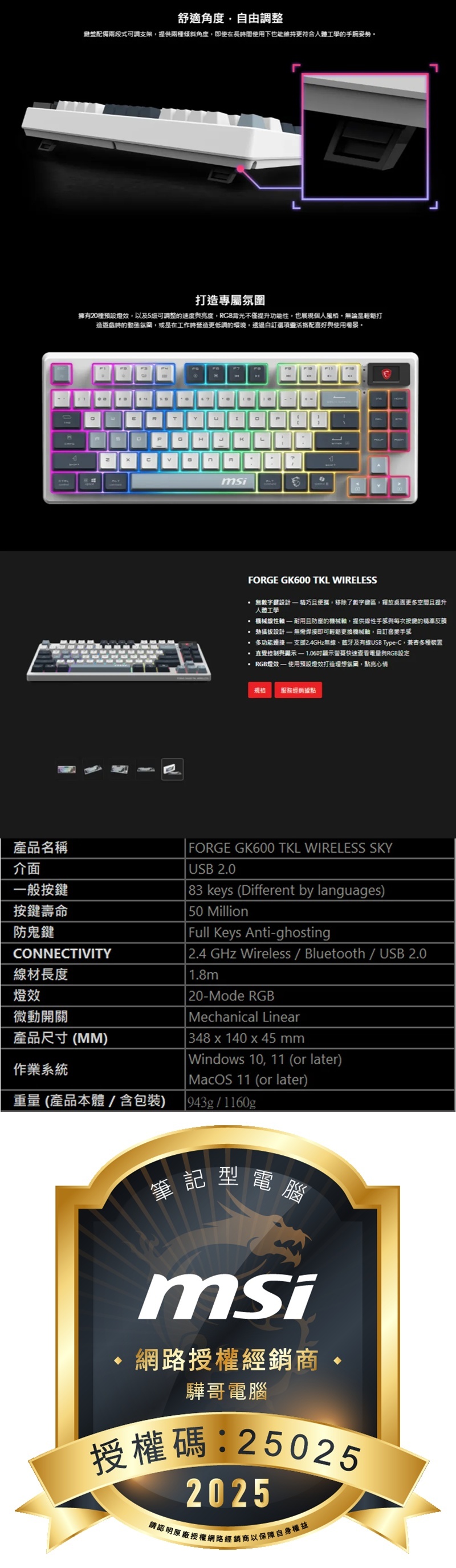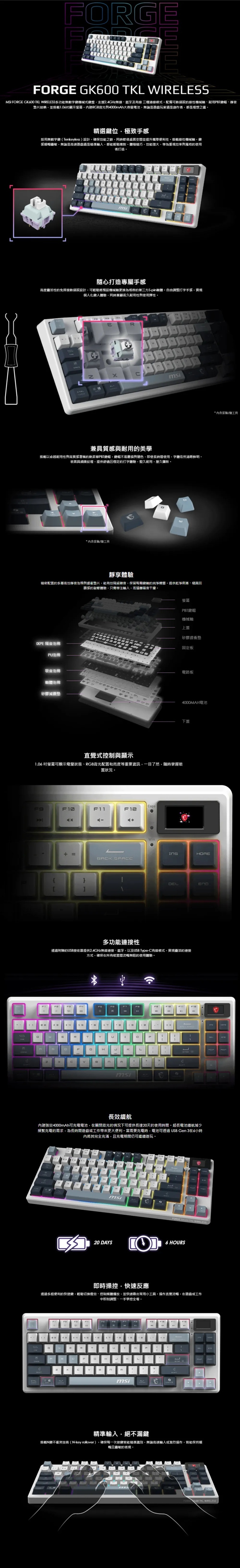 MSI 微星 FORGE GK600 TKL W SKY TC 電競鍵盤 (線性機械軸)