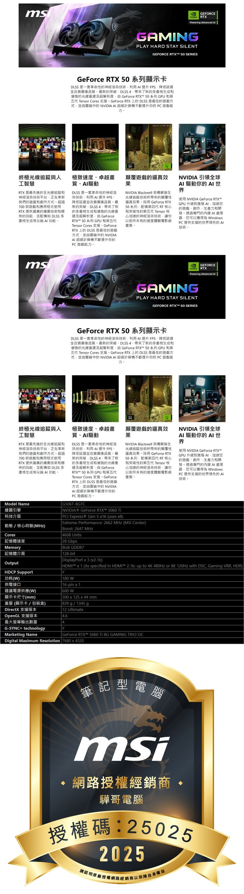 備註:以上規格如有任何問題,保固範圍及相關服務規範,請依MSI原廠公告為主