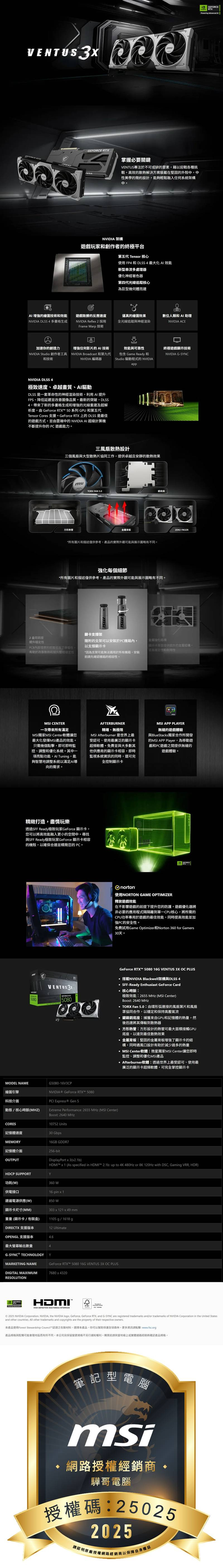 MSI 微星 GeForce RTX 5080 16G VENTUS 3X OC PLUS 顯示卡