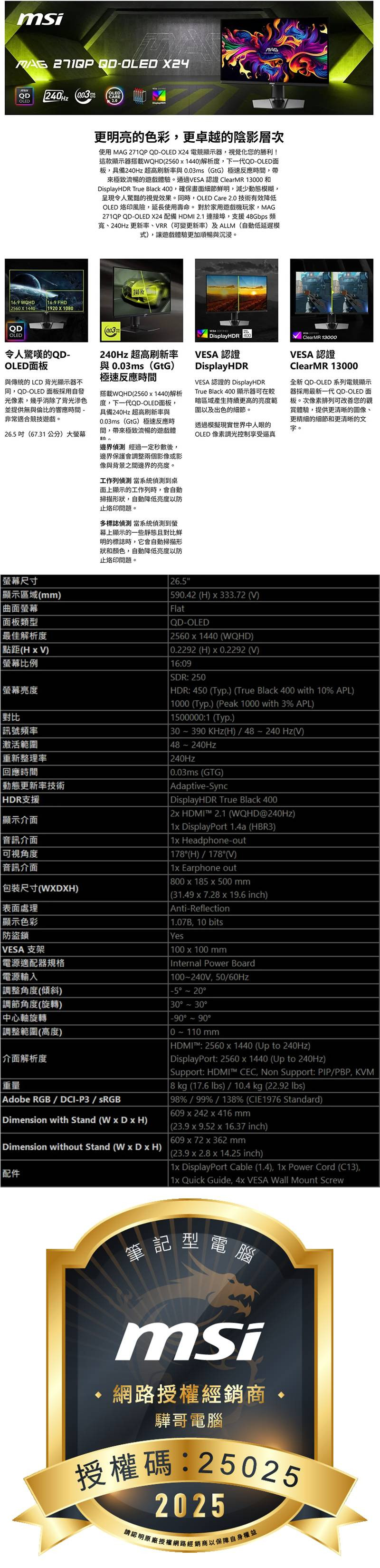 MSI 微星 MAG 271QP QD-OLED X24 平面電競螢幕 (27型/2K/240Hz/0.03ms/QD-OLED/Adaptive)