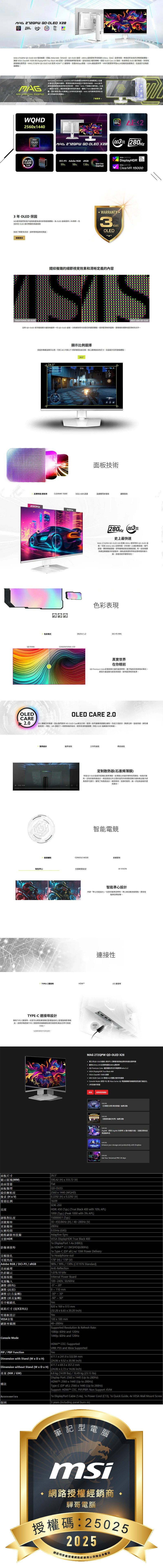 MSI 微星 MAG 272QPW QD-OLED X28 平面電競螢幕 (27型/2K/280Hz/0.03ms/QD-OLED/Adaptive)