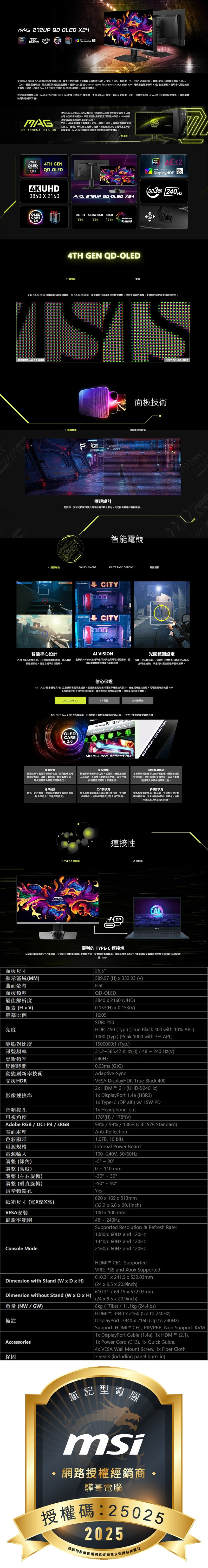 MSI 微星 MAG 272UP QD-OLED X24 平面電競螢幕 (27型/4K/240Hz/0.03ms/QD-OLED/Adaptive)