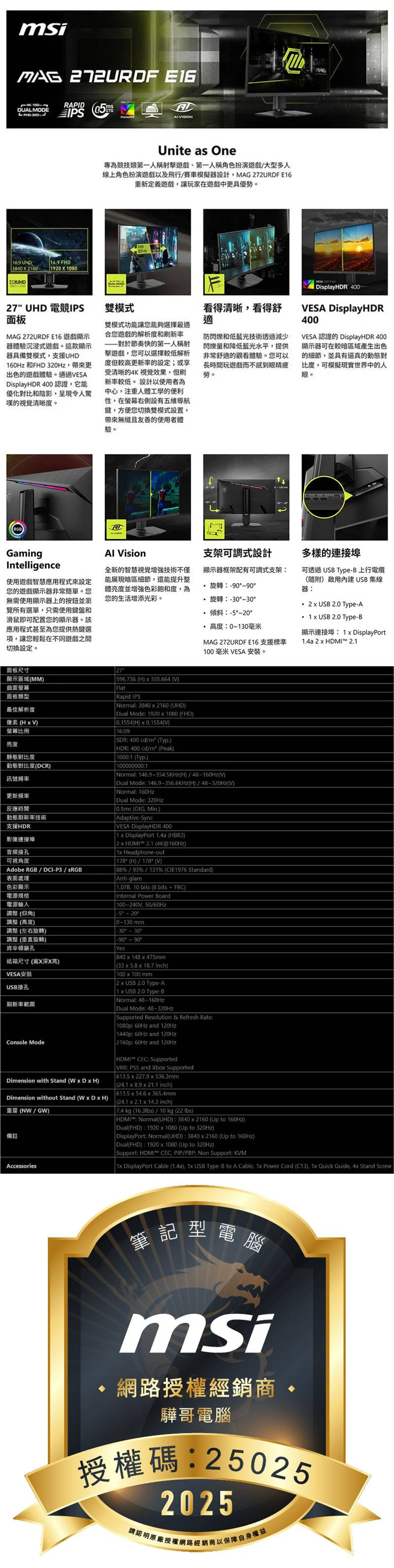 MSI 微星 MAG 272URDF E16 平面電競螢幕 (27型/4K/HDR/160Hz/0.5ms/IPS)