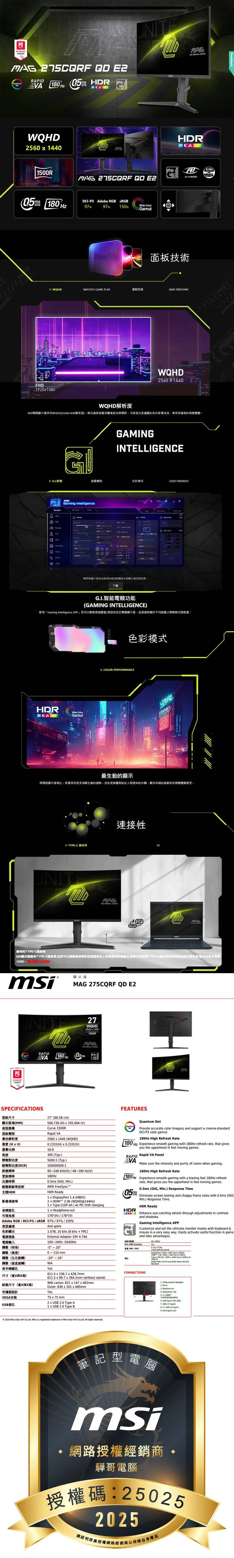 MSI 微星 MAG 275CQRF QD E2 電競曲面螢幕 (27型/0.5ms/180Hz /Type-C/FreeSync/VA/2K/1500R/可調式支架)