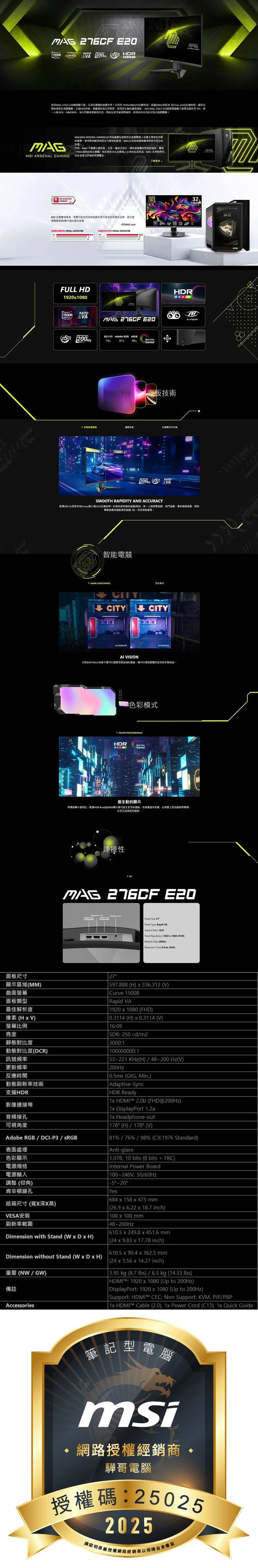 MSI 微星 MAG 276CF E20 曲面電競螢幕 (27型/FHD/HDR/200Hz/0.5ms/VA)