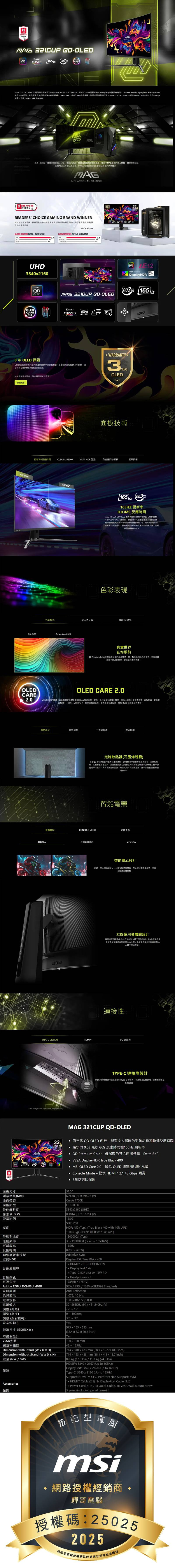 MSI 微星 MAG 321CUP QD-OLED HDR 曲面電競螢幕 (32型/4K/165Hz/0.03ms/QD-OLED/Type-C)