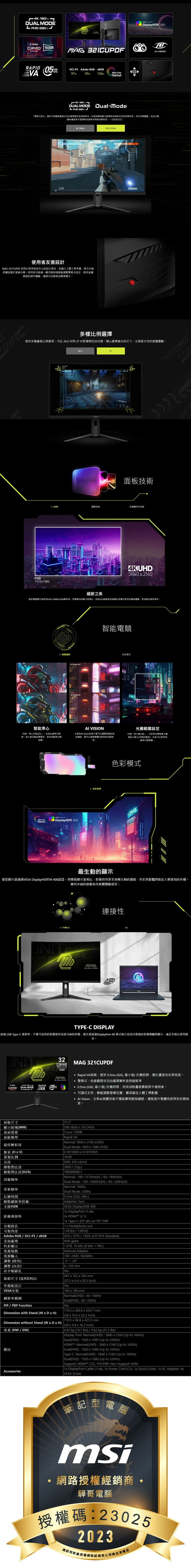 MSI 微星 MAG 321CUPDF 曲面電競螢幕 (32型/4K/HDR/160Hz/0.5ms/VA)