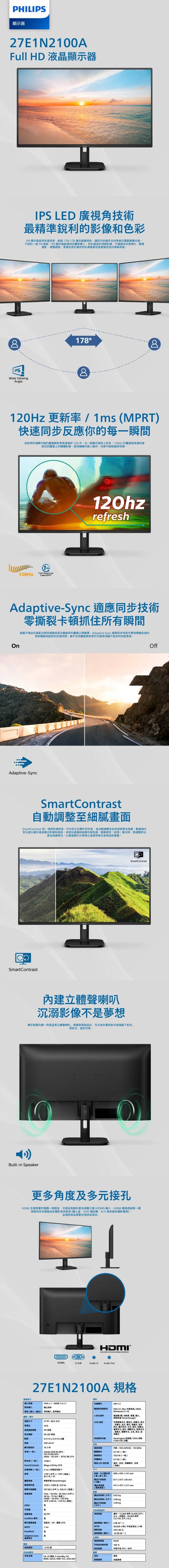 Philips 飛利浦 27E1N2100A 窄邊框螢幕