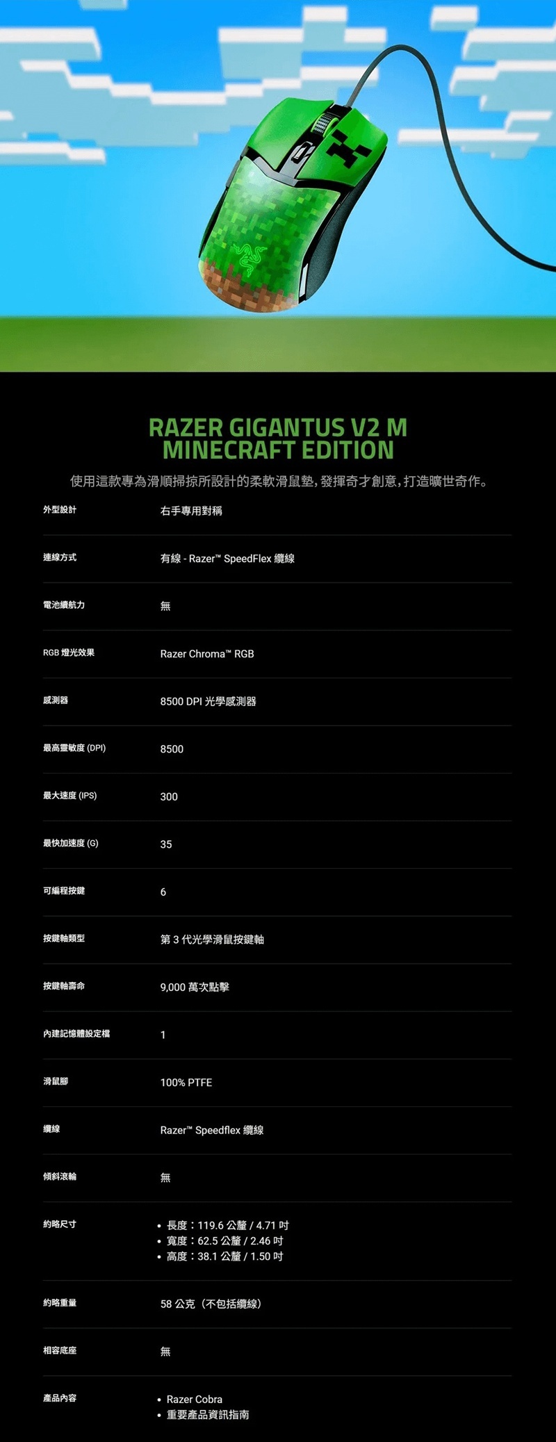 RAZER 雷蛇 Cobra 輕量有線遊戲滑鼠-Minecraft 限定版