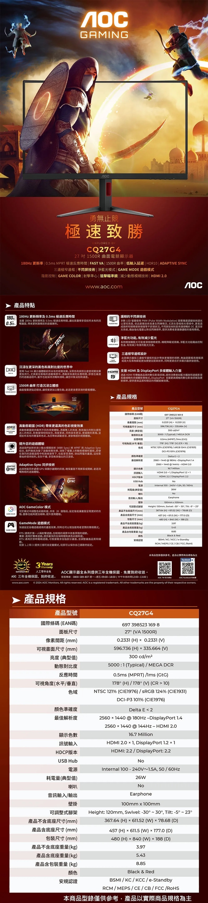 備註:以上規格如有任何問題,保固範圍及相關服務規範,請依AOC原廠公告為主